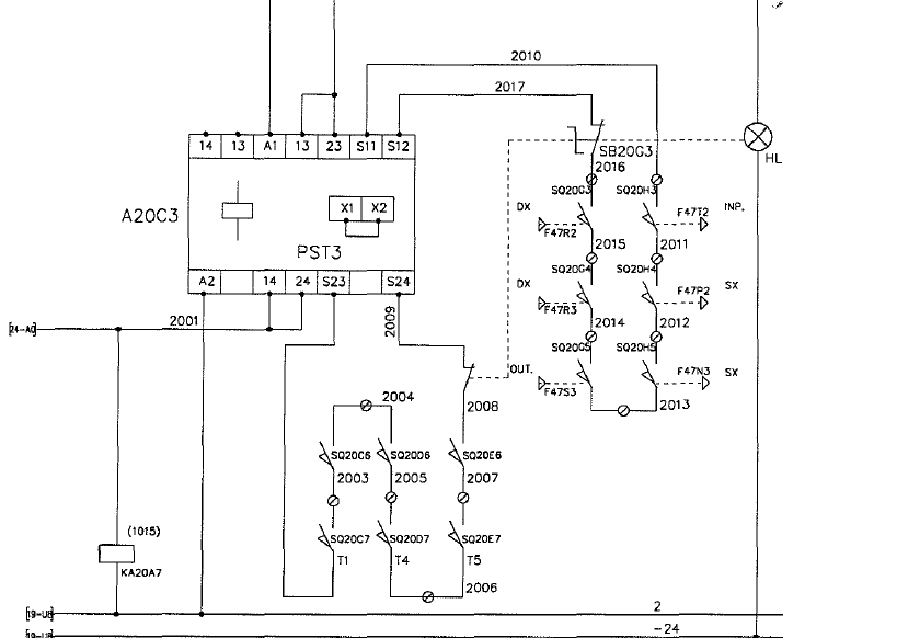 這個是一個意大利進口設備的圖紙上面的。沒有看見這個東西的實物。分析原理圖,這個東西 應該是把一系列的行程開關串并聯,滿足條件后動作自身的繼電器的這樣一個東西。