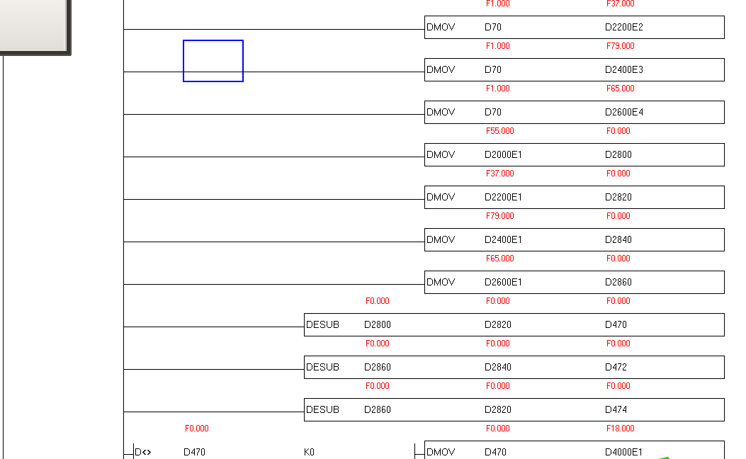 通過E1、E2、E3、E4變址將電機的脈沖數存在D2000、D2200、D2400、D2600連續寄存器內,現在要將對應寄存器的數據進行兩兩相減,要用到哪些指令進行處理。
