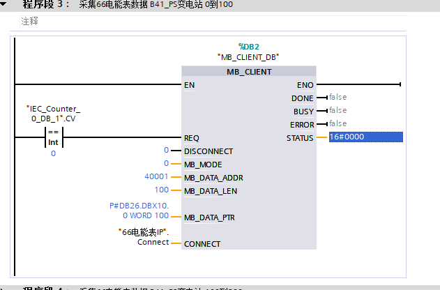 可能出現通信擠兌的情況,就是同時有通信指令在進行,時間長或者次數多了可能會宕機。 建議你優化下輪詢程序,比如每條指令做好充足的時間間隔,如果有站掉線,時間會延長。把S7、TCP等同一網口的通信指令進行輪詢,避開同時觸發。 我看你DONE\ERROR并沒有使用。實際官方的例程是有使用的。 當REQ觸發,DONE或者ERROR觸發后,REQ復位,下一個站REQ觸發,DONE或者ERROR觸發后,下一個站REQ觸發...... 其次,單條指令的最大字數好像是128個,而你100個字也算多了,modscan測試少有讀100個地址穩定不掉線的情況。一般二三十個是可以穩定的。 地址讀多了或者讀到無效地址就會導致掉線,你可以減少單個指令讀取的字數,一個指令讀不完就分兩個指令來讀,且盡量是說明書上的有效地址范圍。 [ 此帖被fczxjh在2025-04-15 11:23重新編輯 ] |