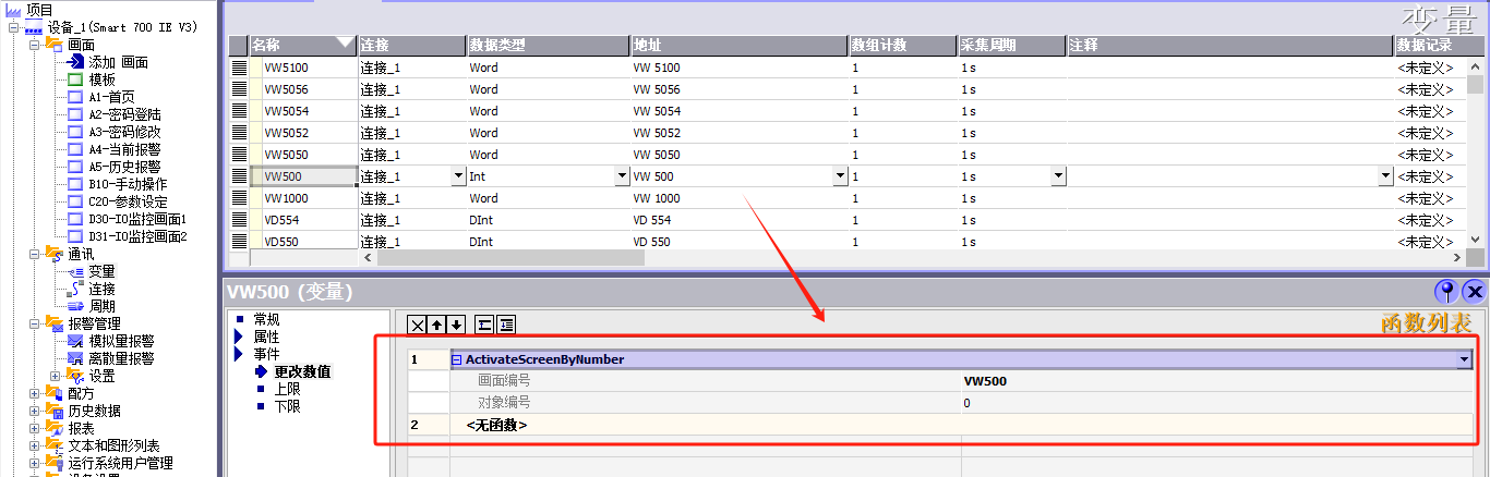 西門子觸摸屏建立了變量VW500用來切換畫面