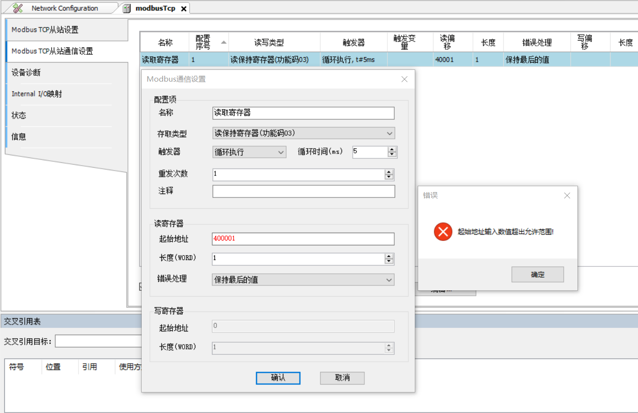 如下如所示,匯川AM403做 MODBUS TCP主站讀取從站(通過北辰BCNET-FX連接FX3U PLC)地址400001時報錯。網(wǎng)上搜索說是從站使用了擴展的地址空間,那主站如何應對呢,AM403是否支持擴展尋址功能呢?