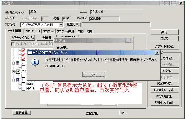 一設備CPU型號Q06UDH,用三菱編程軟件GX-Developer將備份程序寫入PLC時(程序寫入對象存儲器為:PLC Memory/Device Memory),問題提示為驅動容量不足(無通訊問題),