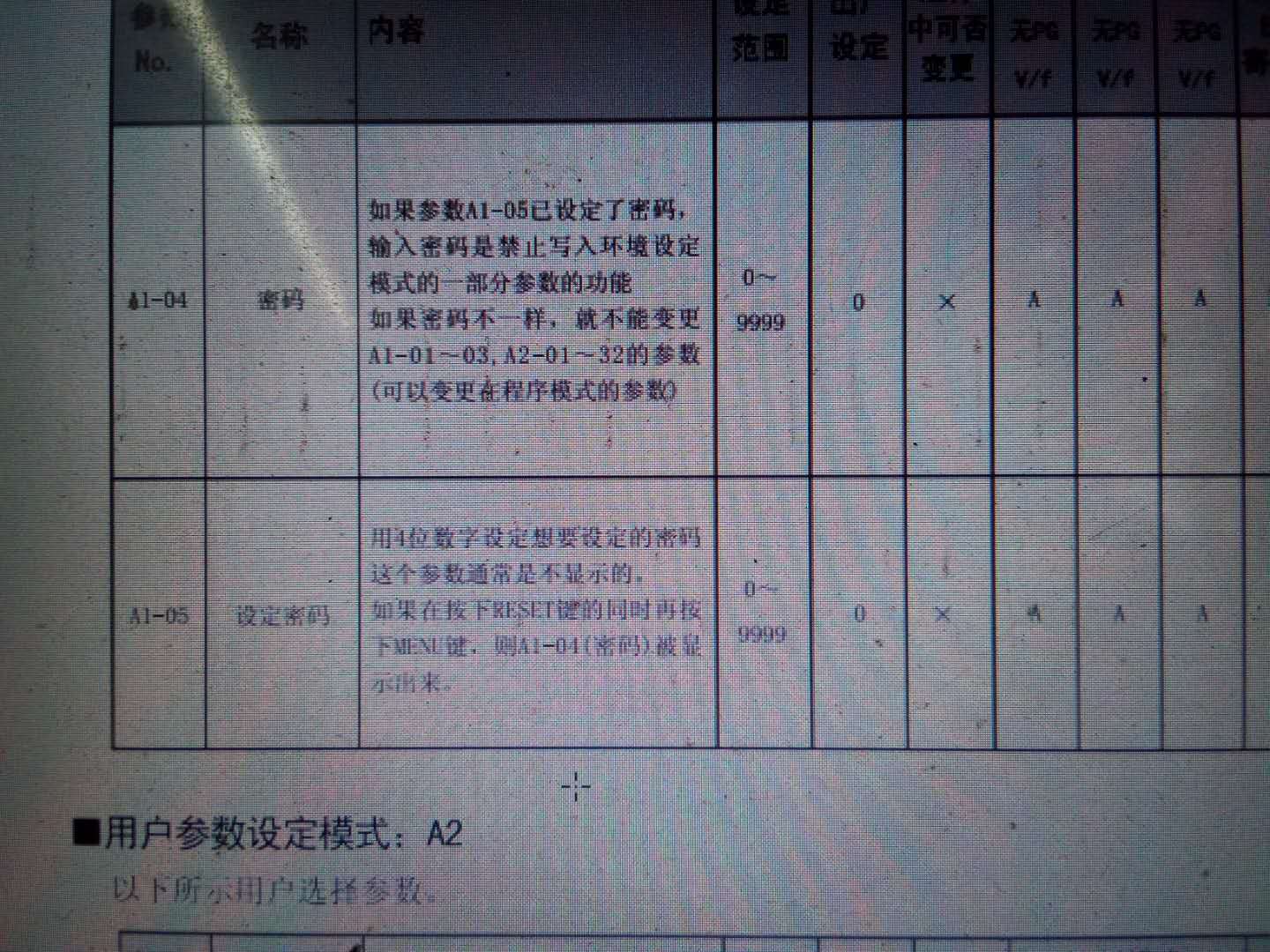 遇到一機器的安川變頻器f7,因為參數設置不當,設了密碼無法進入修改,按網上說的a1-04進去的方法都不行,不知道誰還知道別的好方法么?或者清除好讓我重新設置也行。