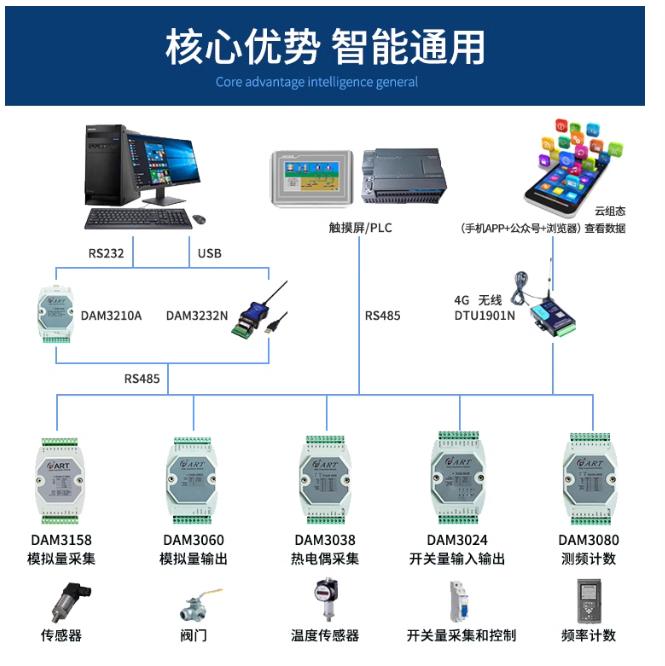 DAM-3049 為 15 路熱電阻采集模塊。同時具備 RS232 和 RS485 兩種通訊接口,支持標準ModbusRTU 協議。配備良好的人機交互界面,使用方便,性能穩定。