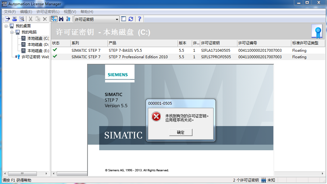 本人新手,新安裝了個STEP7 V5.5 SP5,密鑰也安裝成功了,但是軟件顯示“未顯示有效許可密鑰”,現在我不知道到底是哪個步驟出現錯誤了,如何哪位老師有最新的密鑰許可軟件也可以。