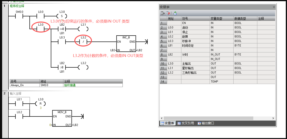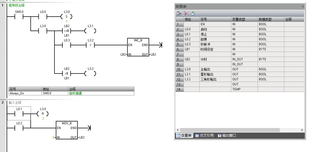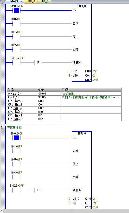 smart200做一個帶參星三角子程序,調用兩次。I0.0啟動時,兩個子程序都會有輸出。實在想不出哪個地方做的不對,請師傅們幫我看一下,錯誤在哪兒?!
