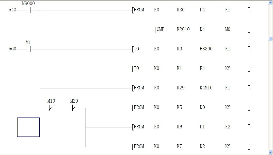 初學(xué)者,見笑,我想采集0號(hào)位置的外接模塊FX2N-4AD的信號(hào),4個(gè)通道,1和2通道為電壓0-10V,3和4通道為-20mA到20mA電流信號(hào),1通道采集的數(shù)據(jù)存放到D1210,2通道采集的數(shù)據(jù)存放到D1211,3通道采集的數(shù)據(jù)存放到D1000,4通道采集的數(shù)據(jù)存放到D1002,請問程序該怎么編?