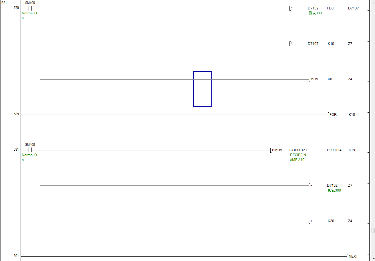 如圖P21子程序是一個設備的recipe在觸摸屏上的列表顯示的算法,上下頁控制,一頁顯示10個,一個recipe存儲占300字。