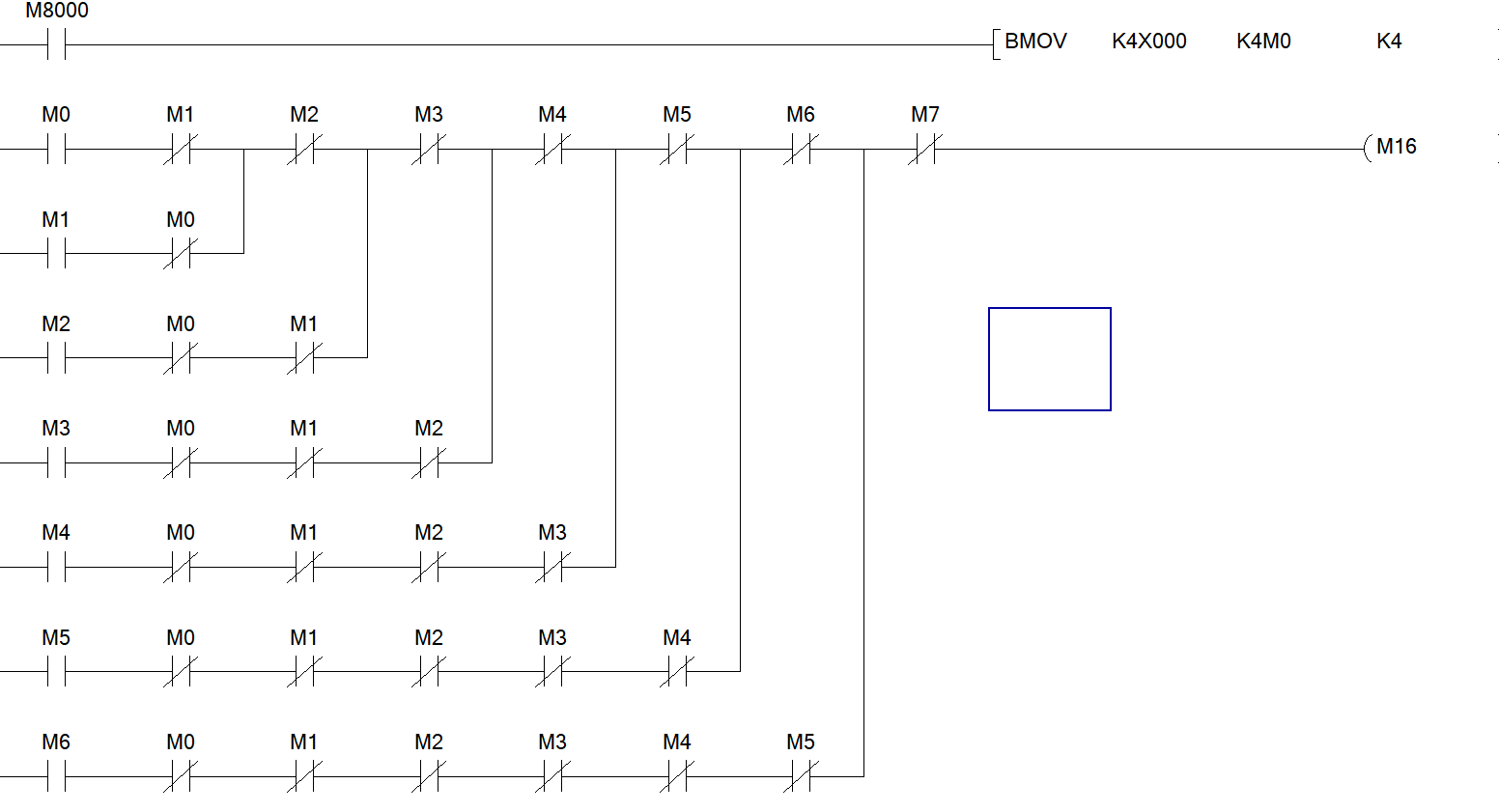 求教一下,,這段程序有沒(méi)有別的方法可以更簡(jiǎn)單一點(diǎn)的。本人新學(xué)三菱PLC。16個(gè)信號(hào)不能同時(shí)有兩個(gè)或以上的輸入