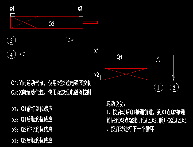 不好意思,運動說明的確寫錯了一個數字,正確的應該是:按啟動后Q1接通前進,到X1點Q2接通前進到X3點Q1斷開退回X2,斷開Q2退回X4,按啟動進行下一個循環。