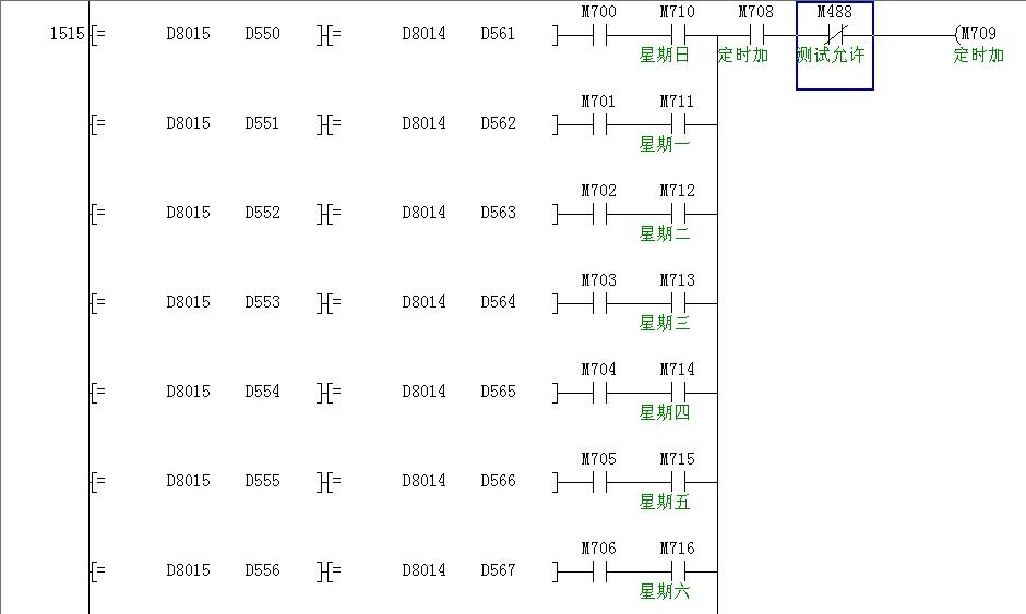 D550起是觸摸屏的時,分設定寄存器,M700-M706是用與不用選擇,M710-M716就是我上面加上去的星期幾,可以用d8019直接寫。測試允許是我們機器上用的不必理會。