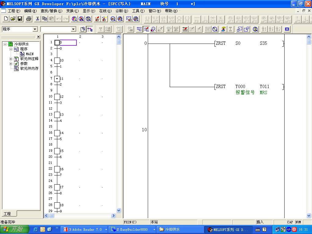 這個程序是用SFC編的,右邊的梯形圖是SFC圖中帶藍框那個狀態的驅動程序,選擇工程,編輯數據,改變數據類型,選擇梯形圖語言,便可顯示全部的梯形圖
