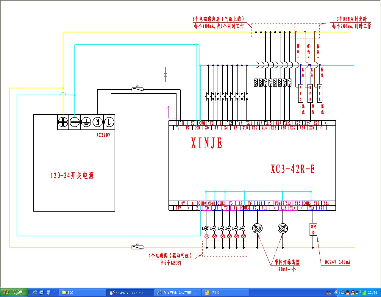 請看圖,采用的是信捷XC3-42R的PLC,AC220V接入。程序已編好,只差接線,我在網上查了好久了,大概有1個月的時間。但沒有找到相關的接線方案,這些都是借助參考網上的各類接法,自己繪出來的圖,用CAXA畫的,已上傳原文件,分別有CAXA和CAD文件。如圖片看不到的,請好心人下回來幫我修改錯誤的地方,學生感激不盡。謝