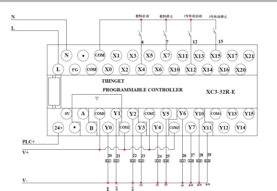看了一下樓主的圖紙有幾點沒畫好, 一:,AC220電源標示的不好,只是把開關(guān)電源和PLC相連通并沒有電源的進線標示.開關(guān)電源輸出端子沒有標示DC24V,(雖然開關(guān)電源型號上已注名120W24V,最好還是在接線端上標示一下最好不過了.) 二:輸入的磁感應(yīng)開關(guān)接線沒有畫好,漏刑PLC的輸入端X在沒低電平導(dǎo)通時其內(nèi)部回路是高電平信號,樓主所畫的磁感應(yīng)開關(guān)另一端接DC24V正極也就是高電平信號,所以不能構(gòu)成回路無法工作,要改接至DC24V負極端. 三:PLC輸出部分的電磁閥線圈不能串入指示燈,可以用并聯(lián)接法.