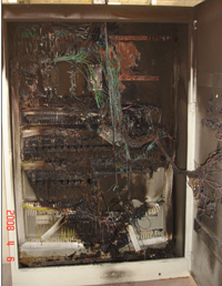 3 原因透析 :起因應(yīng)該是倒數(shù)第二排線槽下面的元器件,從旁邊的布置來看應(yīng)該是接觸器進(jìn)線部位首先發(fā)生短路,原因可能是接線不牢和異物,也有可能是品質(zhì)問題,接觸器短路而小型斷路器沒能及時(shí)脫開,導(dǎo)致電線發(fā)熱絕緣損壞引起小型斷路器的進(jìn)線短路,因?yàn)闆]有總斷路器,分線銅排因電弧發(fā)生長時(shí)間嚴(yán)重短路,并引起進(jìn)線短路,導(dǎo)致出線槽也有燒毀痕跡。