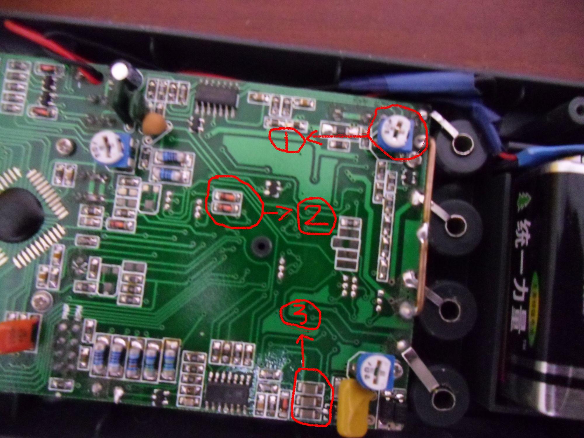 今天我拆了我自己用的數(shù)字萬用表看看,里面的有些元件不認識,還請大俠們幫忙指認,圖中標的1,2,3處指的都是什么東西呢?