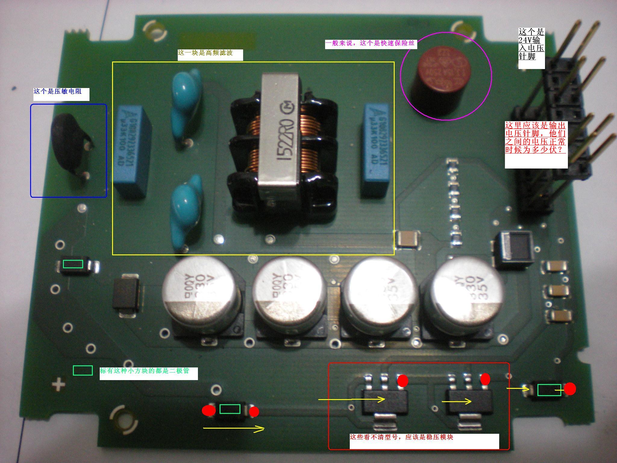 電壓測量我標注在圖上了,凡是紅點的都應該在+24V 左右,哪個點沒有,就是前級原件壞了,