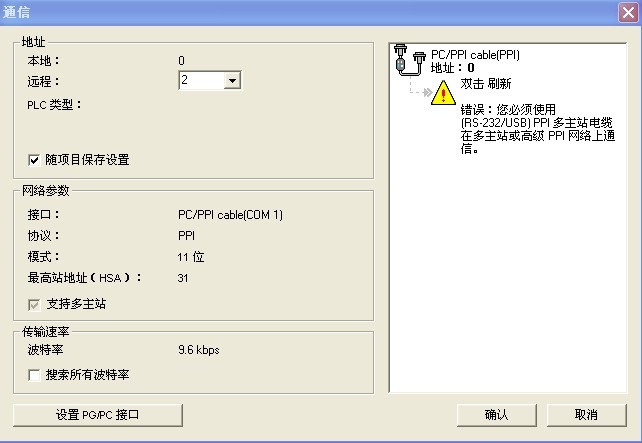 PC機(jī)與一臺(tái)PLC點(diǎn)擊通信顯示:錯(cuò)誤:您好必須使用(RS2-232/USB)PPI多主站電纜在多主站或高級(jí)PPI網(wǎng)絡(luò)上通信