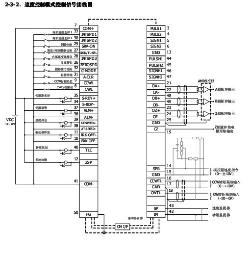 用作速度控制時,有兩種速度指令方式,一是通過外部模擬量(0~10V),二是通過設定內部速度參數,son通表明伺服準備運行條件成立,通過正轉、反轉命令進行運轉。內部還有正轉極限和反轉極限,通過外部感應器就可以實現正反轉停止動作。
