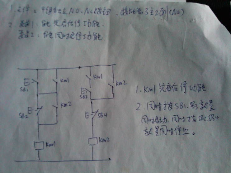 1、先后啟停  按下SB3,KM1啟動,按下SB2, KM2啟動。按下SB4,KM1停止,按下SB1,KM2停止。