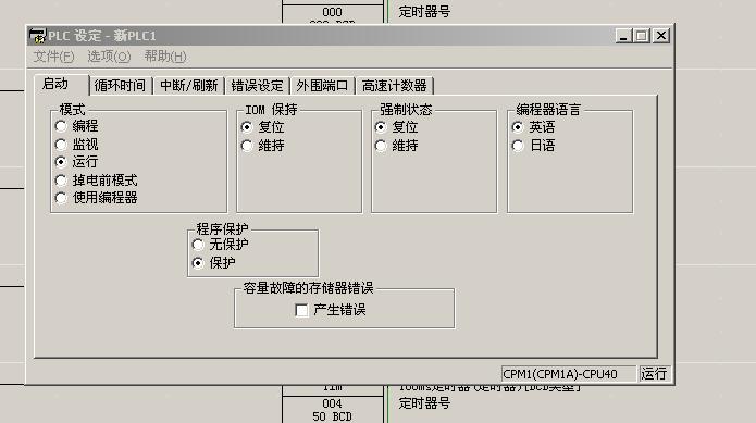 由于剛學(xué)習(xí)歐姆龍的PLC,型號(hào)是CPM1A-40CDR-A,我把編程好的新程序傳送到PLC里面,老是有錯(cuò)誤,之前我對(duì)PLC改動(dòng)了一下,把運(yùn)行模式改為掉電前模式,現(xiàn)在就出了這個(gè)問題,現(xiàn)在老的程序也不在運(yùn)行狀態(tài)了(PLC的運(yùn)行指示燈不亮),把PLC斷過電之后,然后送電,這樣PLC的運(yùn)行指示燈就亮了,老的程序才能運(yùn)行,發(fā)現(xiàn)一個(gè)怪現(xiàn)象,電腦和PLC連接好以后也就是連線了,PLC的運(yùn)行指示燈是亮的,如果離線了,PLC的運(yùn)行指示燈就不亮了,老程序工作不起來,然后把PLC斷電,然后再送電,PLC運(yùn)行指示燈就亮了,這樣PLC就能動(dòng)作了,就是沒辦法把新的程序傳到PLC里面,傳送不上去,請(qǐng)問各位老師是不是PLC設(shè)置哪里出問題了!請(qǐng)賜教!網(wǎng)上有哥們叫我把內(nèi)存刪掉,也刪不掉,不知是哪里設(shè)置出問題了!還有就是軟件里的掉電前模式具體的是什么意思,還有錯(cuò)誤日志是什么意思,搞不懂!