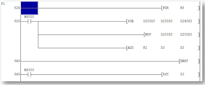 變址的目的能減少判斷程式的容量,如mov K20 D100Z1,假如Z1的值為23,那麼指令的意思相當於MOV K20 D123,如果能理解FOR,     NEXT循環(huán)指令的用途,可用很少的程式記錄很多的數(shù)據(jù),很好用的,絕對能實現(xiàn)你之前提出的動作要求。