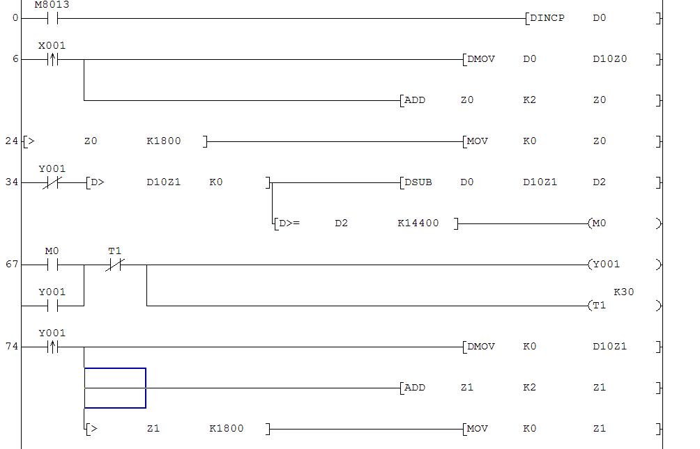 M8要換成M8014,這是我測試時寫的,改成M8014每分鐘觸發計數一次,如果某個產品在M8014剛觸發后進入,會發生少計1分鐘現象,對於老化時間4小時來講可以忽略不計。程式循環過程中,有東西就會計數,沒有就跳出執行,該程式主要提供思路,細節需要自己修正。