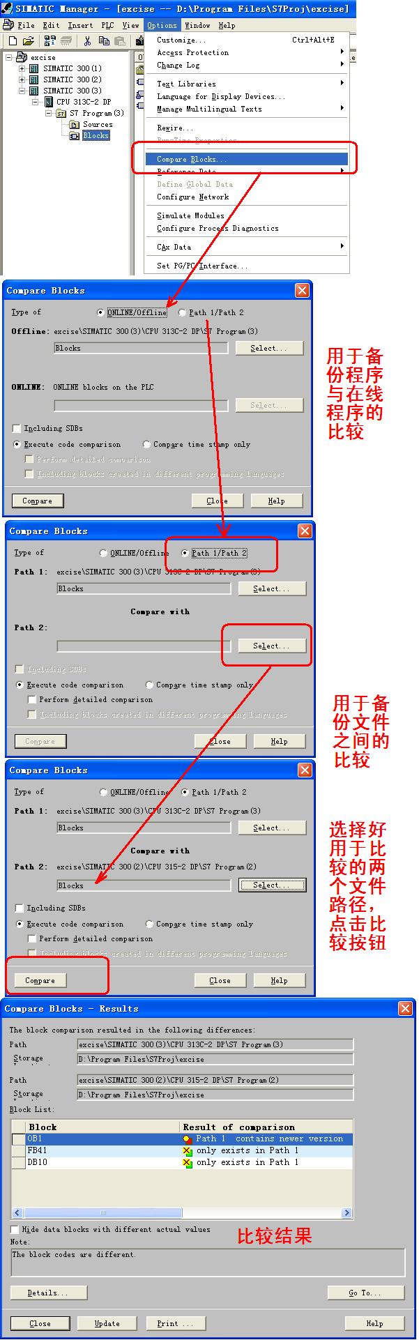 S7-300可以進(jìn)行離線程序與在線程序的比較,也可進(jìn)行離線程序之間的比較。