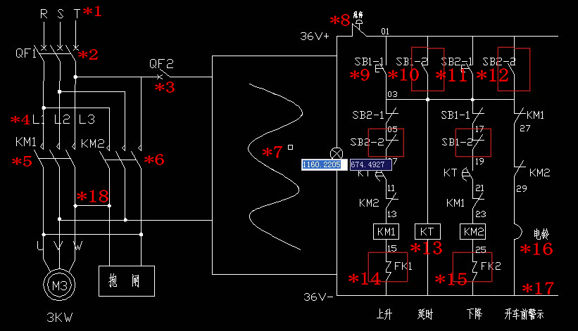 *14:—*15:“FK1”和“FK2”所示的圖形符號與文字符號是哪一類的器件?我個人猜測,可能是“熔斷器”。如果是熔斷器,圖形符號與文字符號的標注是錯誤的。其文字符號是:FU1、FU2。況且,在這個控制系統(tǒng)中使用一個即可。該圖形符號繪制的位置:36V+端與急停按鈕前端之間。