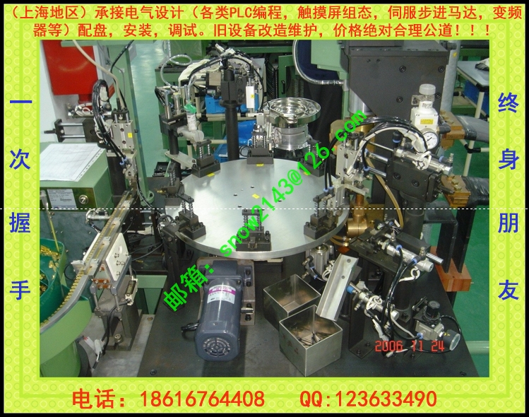 (上海地區)本人有10年多的非標設備設計經驗,主要為汽車制造業和食品包裝業 電子行業,精通三菱,西門子,松下,歐姆龍,臺達 AB 等PLC;以及上位機程序界面開發,運用VB等。三菱,松下 臺達等伺服電機,發那科,ABB,安川等機器人;現承接電氣設計,配盤,安裝,調試。舊設備改造維護,有多人團隊,我做過大量大型項目,歡迎指導,價格絕對合理公道!!! 電話:13564070882  陳工