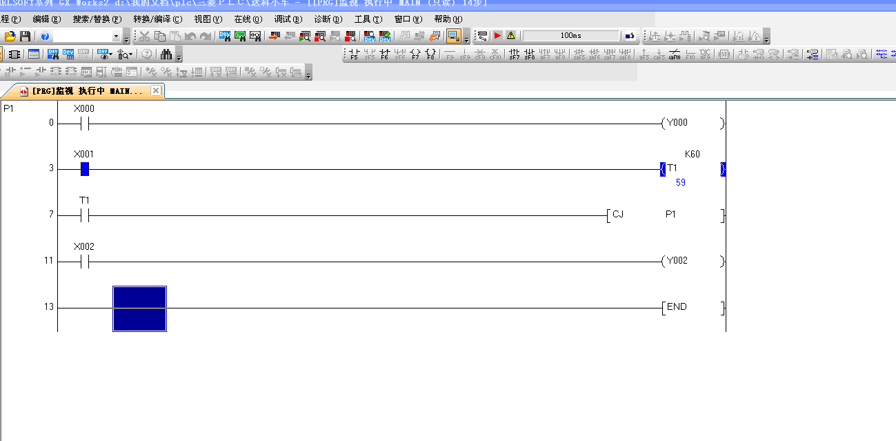 原因是在P1中跳轉到P1,當T1當前值為60時候,此段程序就進入了死循環,進入了死循環的PLC此次掃描沒有執行到END,所以60這個值是不會發送到監視,只能看到死循環前的數字59.而PLC是由保護措施的,出現這種情況是時候會自行處理恢復的,所以就出現了1兩秒后又開始