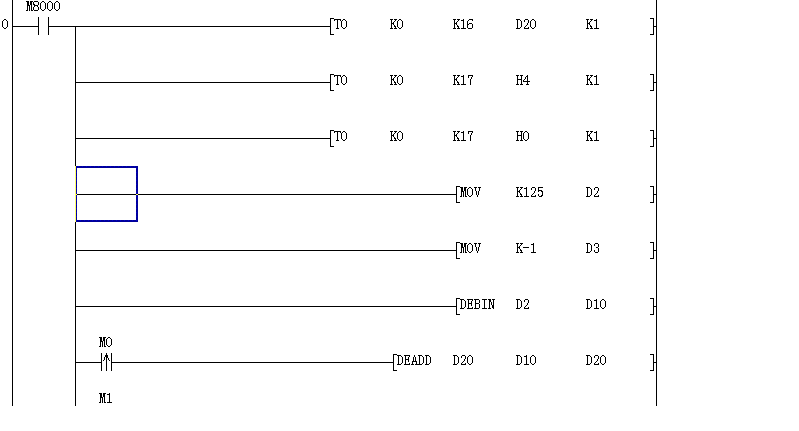 如圖,按M0時要求D20每次加12.5,但實際調試時TO指令里D20為0,而DEADD里的D20指令可以顯示加的數字,由于前邊D20=0,所以模擬量輸出老是4毫安不變,希望大家指教,多謝。