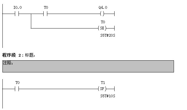 按下啟動(dòng)按鈕I0.0,Q4.0控制的電機(jī)運(yùn)行20S,然后自動(dòng)斷電,同時(shí)Q4.1控制的制動(dòng)電磁鐵開始通電,10S后自動(dòng)斷電。用擴(kuò)展的脈沖定時(shí)器和斷開延時(shí)定時(shí)器控制電路。