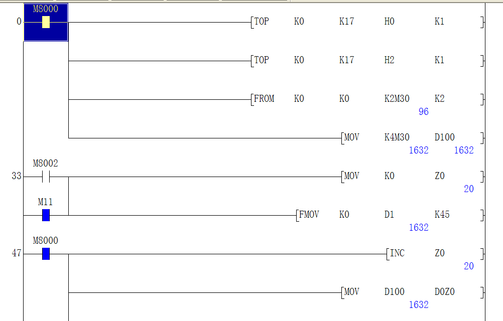 還有就是,為什么第一行的M8000不能持續(xù)讀取模塊的值,我試驗過,我手動按鈕操作可以讀取,還有就是每次STOP再RUN之后讀取的值也不一樣,相當于一個掃描周期之后,不讀取模塊值,而下面一行的M8000卻可以自動的INC Z0   請問這是什么原因啊,求指導的~~~~~~下面是截圖