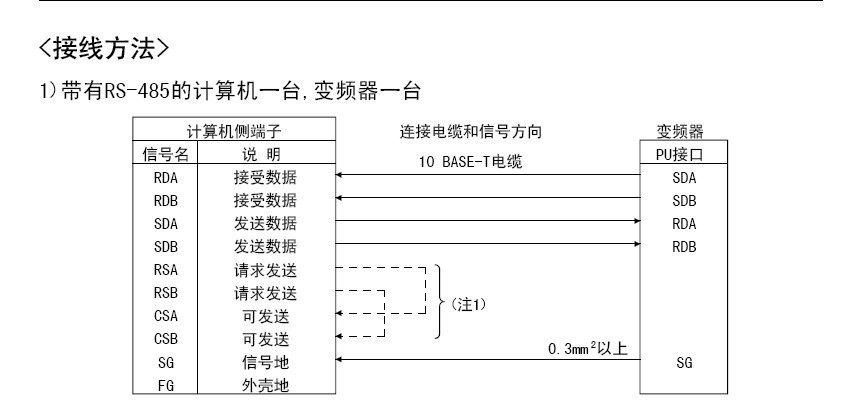 想修改三菱E500變頻器的參數,由于沒有操作面板,沒辦法修改參數了,就想到用變頻器參數調試軟件來修改,但在變頻器與PC接線中遇到一點問題,如圖所示,為變頻器說明書上介紹的關于變頻器PU口與RS485頭接線圖,由于PC沒有RS485口,特買了個RS232轉RS485的轉換頭,但這個轉換頭RS485端只有三個接線柱,為一個正端,一個負端,還有個接地端,可能是RS485兩線制的,可說明書介紹的是RS485四線制的接法,這可怎么辦?這個轉換頭還能用嗎?可以用的話,該怎么接?大俠來說說你的想法。謝謝