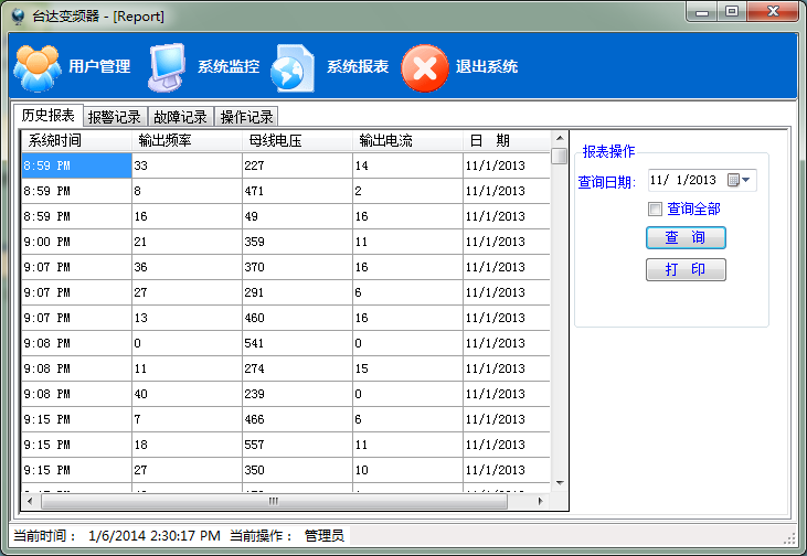 自己在.NET下用C#開發的上位機,做的是和臺達B系類變頻器的通訊,主要是控制起停、修改頻率、模擬變頻器控制面板、報表、登錄等等 用的是SQL數據庫,寫這種軟件關鍵做的是數據處理以及深入理解計算機通信原理!這個是自己寫著完的,已經調試好了,效果還是不錯的,就是報表打印這一塊沒有做,也就是一個reportview控件的使用!