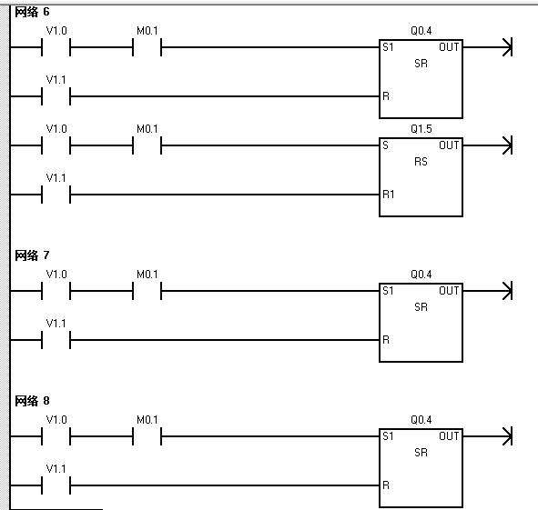 請教各位:我是西門子PLC的一個初學者,以前一直用三菱的PLC,在編梯形圖的時候沒有遇到以下情況。西門子的一些命令,如RS觸發器,前面必須要連到左母線上去,連接一些觸點或者輔助繼電器都不行,請見下圖。