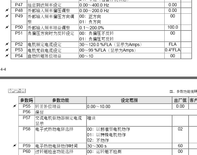 就是P52,照著電機銘牌設,不過設定的范圍不要超過1.2倍。P53空載電流也設一下,P53值小于P52