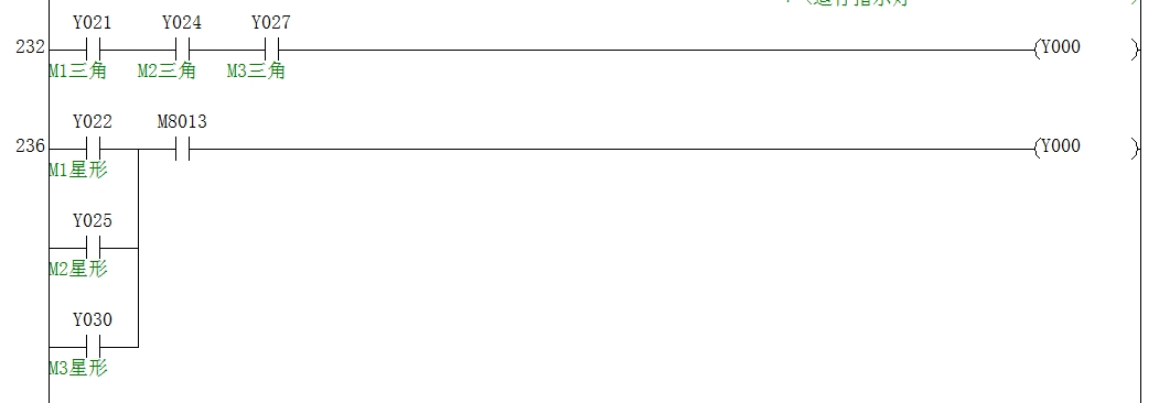 三個電機星三角啟動,所有電機三角運行指示燈(Y000)常亮 ;任意一個電機星形運行則指示燈閃爍。星三角帶互鎖。