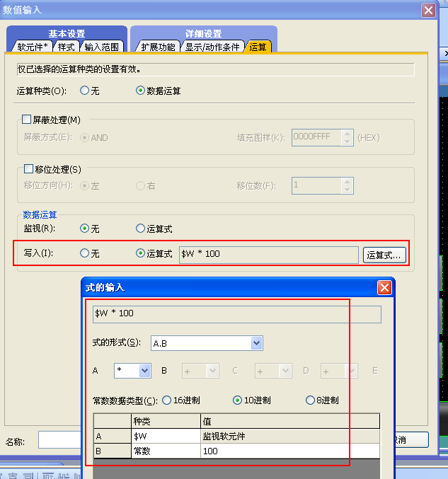不知道你的觸摸屏有沒有這功能。數(shù)據(jù)輸入的屬性對(duì)話框里,可以選擇“運(yùn)算”這個(gè)功能。 你在輸入框中輸入50, 它會(huì)把50x100=5000發(fā)送給PLC。 見下圖示例。