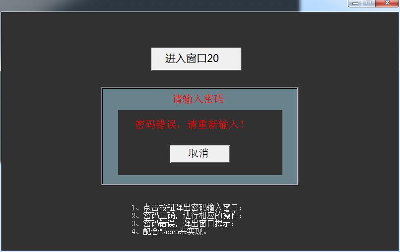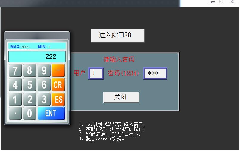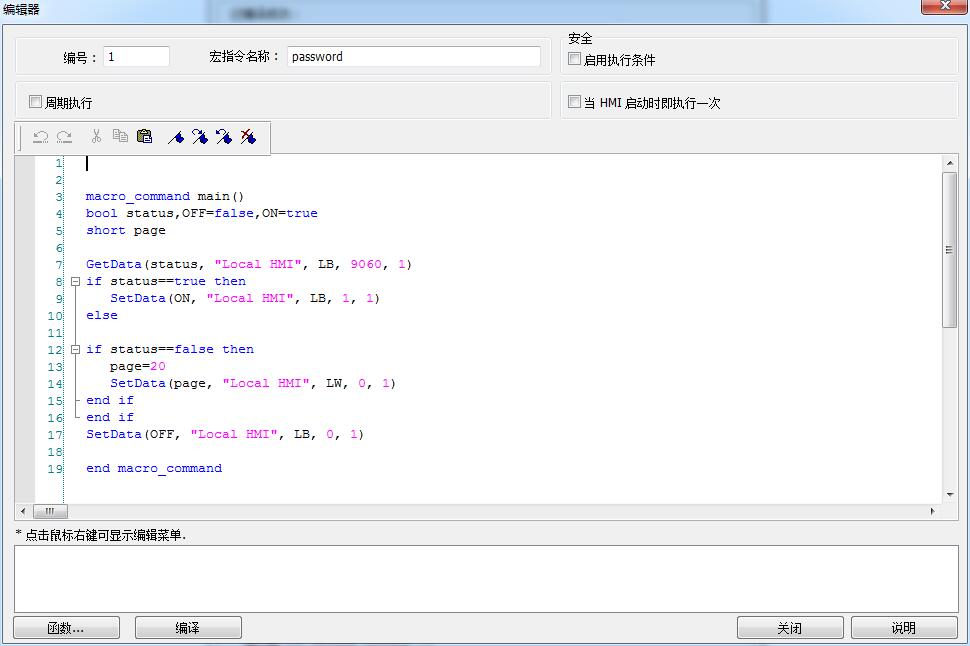 引用引用樓主a86116403于2017-04-13 14:31發(fā)表的 關(guān)于威綸通官網(wǎng)案例密碼登錄不了解的一個(gè)問題 :這個(gè)案例是官網(wǎng)上下來的,輸入密碼錯(cuò)誤彈出密碼錯(cuò)誤框,這個(gè)彈窗是怎么談的呢,我找了一下找到這個(gè)宏指令,問題來了,這個(gè)宏指令什么時(shí)候執(zhí)行,但我輸入完密碼點(diǎn)下ENT就彈了,我看過ENT就是一個(gè)功能鍵ENTER,這個(gè)宏指令三個(gè)執(zhí)行的方式都沒勾,什么時(shí)候執(zhí)行的,想不懂