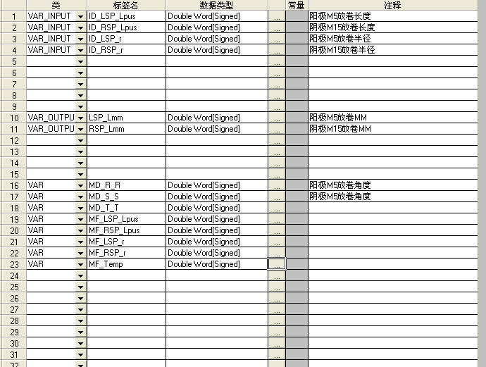 控制要求:放卷電機(jī)放卷過(guò)程中收到 感應(yīng)器信號(hào)后計(jì)算放卷電機(jī)走了多少mm.因?yàn)橛懈↑c(diǎn)運(yùn)算想用ST語(yǔ)言寫,但沒(méi)有寫過(guò),求大神支招!