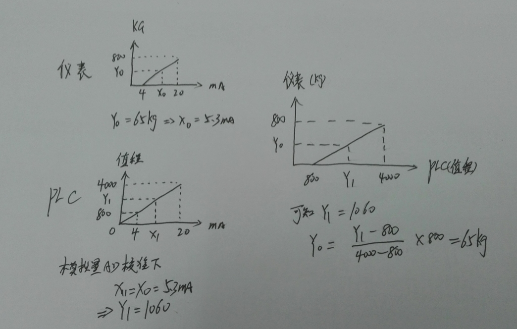 儀表4-20mA對(duì)應(yīng)0-800KG。 PLC  讀取數(shù)值應(yīng)該是 800-4000吧!