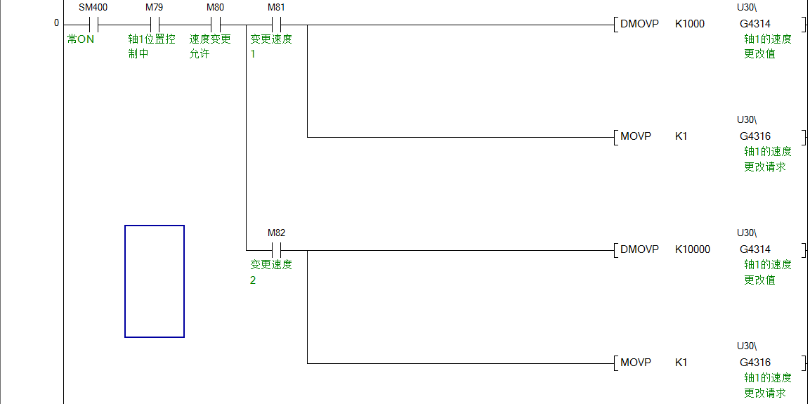 我寫了一個簡化的使用程序,如下圖所示,其中在進行位置控制的軸運動過程中,當M80接通時,運行速度變更為1000,當M81接通時,運行速度變更為10000,這不是完成的程序,詳細邏輯需要根據實際情況補全。