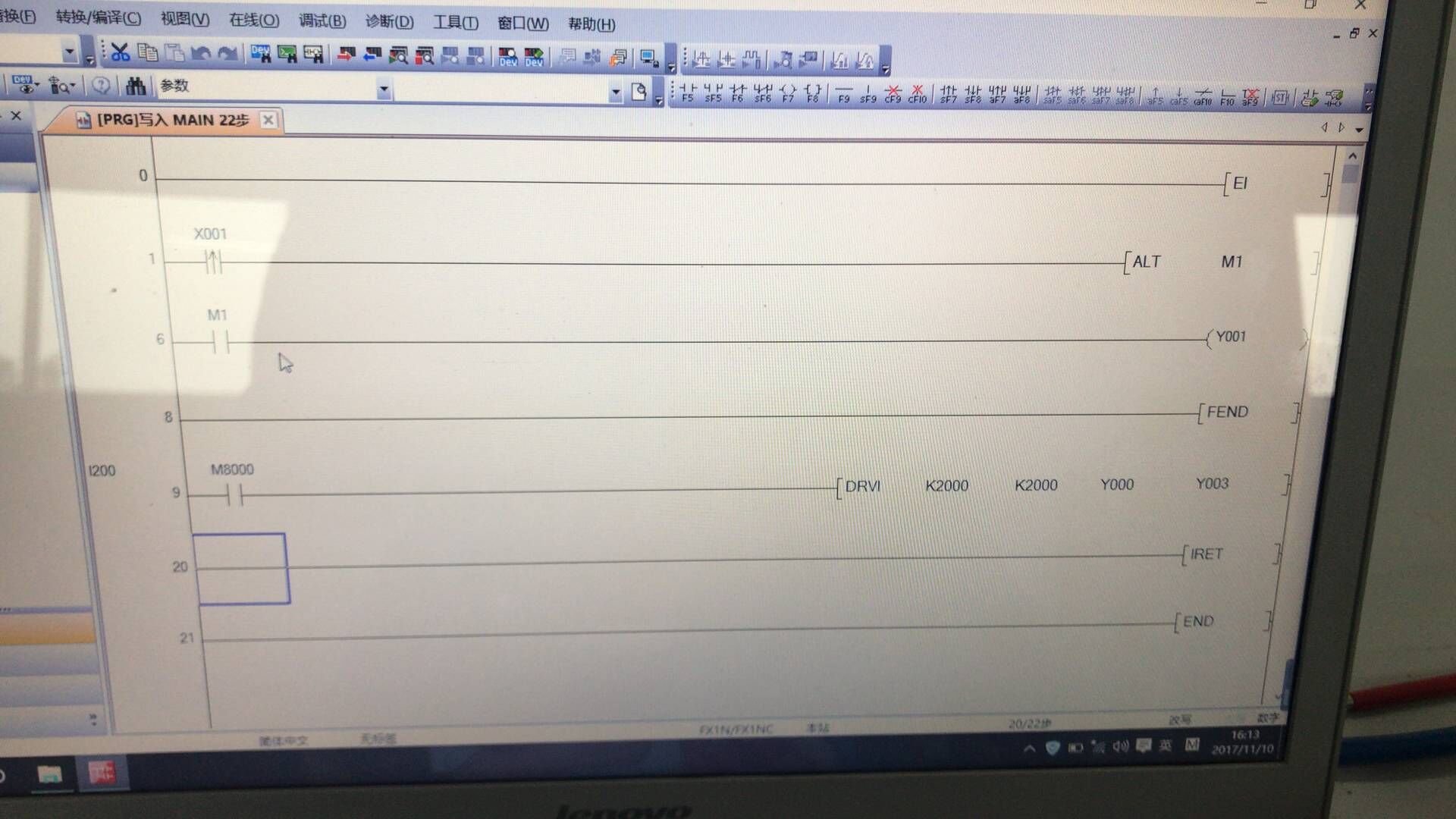 Y1是個(gè)三相異步電動(dòng)機(jī)垂直的放,上面一個(gè)偏心輪帶著刀上下動(dòng)。Y0是個(gè)步進(jìn)電機(jī),水平的移動(dòng)要控制這個(gè)電機(jī)在刀下來(lái)的時(shí)候不動(dòng),刀上去時(shí)才動(dòng)一毫米。X1是啟動(dòng),X2是一個(gè)感應(yīng)器在刀離開水平面是就亮一下。這個(gè)三相異步電機(jī)速度是每分鐘3000轉(zhuǎn)。小弟在公司里要改個(gè)小東西,希望幫忙。