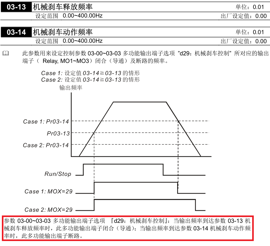 率時,此多功能輸出端子斷路。結合圖表怎么理解。個人理解應該是 03-13>03-14,因為:03-13 為剎車釋放頻率,03-14剎車動作頻率,剎車釋放頻率>剎車動作頻率,這樣當輸出頻率小于3-14時剎車動作。