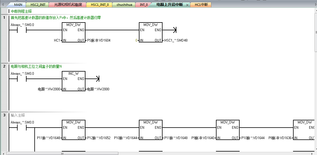 電眼對應I0.0,中斷采用0中斷,也就是電眼發現盒子的時候立即執行中斷程序,中斷程序中采集HC1的數值給VD2000,然后直接賦值為0高速計數器,接著進行數據傳送,最后給HSC1賦新的預設值,在中斷中采用了加法運算,不知道是否可以,,,現象就是我的告訴計數器不知道為什么用這種模式,采集不到數據(排除接線,因為以前的方法直接在主程序采集,都能正常采集數據),還有就是中斷中是否可以包含一些加減乘除的語句,