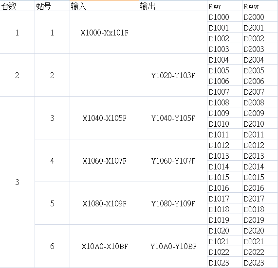 一站占用32個(gè)點(diǎn)位,4個(gè)D值,比如現(xiàn)在有一個(gè)輸入IO站(占用1站),一個(gè)輸出IO站(占用1站),一個(gè)智能站(占用4站),首字是X1000 ,Y1000 ,RWrD1000,RWwD2000(借用6樓的圖)那么這三個(gè)站地址分別為:X1000-X101F(32個(gè)),[Y1020-Y103F(32個(gè)),X1040-X10BF(128點(diǎn))和Y1040-Y10BF(128點(diǎn))],IO模塊沒有寄存器D,智能模塊有,一個(gè)站站4個(gè)D,4個(gè)站占16個(gè)D,所以智能模塊Rwr占用D1008-D1023,Rww占D2008-D2023,如下圖所示 |