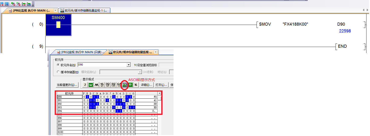是字符傳送指令,把“FX4188K00” 這9個ASCII碼傳送到以D90寄存器為起始的地址中,