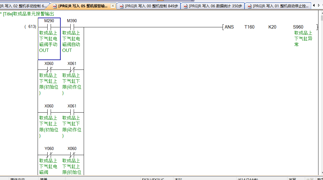 就拿M290和M390來說吧,假設(shè)自動運行時M390--ON的時候,Y60--ON,這個時候進(jìn)行手動模式,不會影響M390---ON,進(jìn)行手動操作讓M290變成ON的,這樣M290常閉點就會斷開M390常開的那條路,也就是控制Y60斷開。如果M290交替再斷開,下面那條路又導(dǎo)通,這樣就可以實現(xiàn)Y60狀態(tài)進(jìn)行轉(zhuǎn)換,當(dāng)手動操作完后,進(jìn)行自動模式后,按啟動按鈕就會把手動操作全部復(fù)位掉,又自動變到之前的自動狀態(tài)。